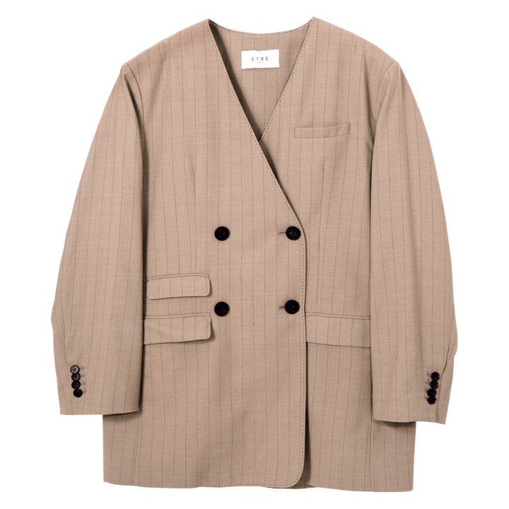 「ピッチにこだわったストライプ柄は、ETRÉ TOKYOオリジナルで作製した生地。メンズライクでオーバーなサイズ感とオーセンティックなテーラリングがモードな雰囲気を演出してくれます。ぜひミニスカートと合わせたスタイリングを」(エトレトウキョウ プレス 雨宮咲子さん)