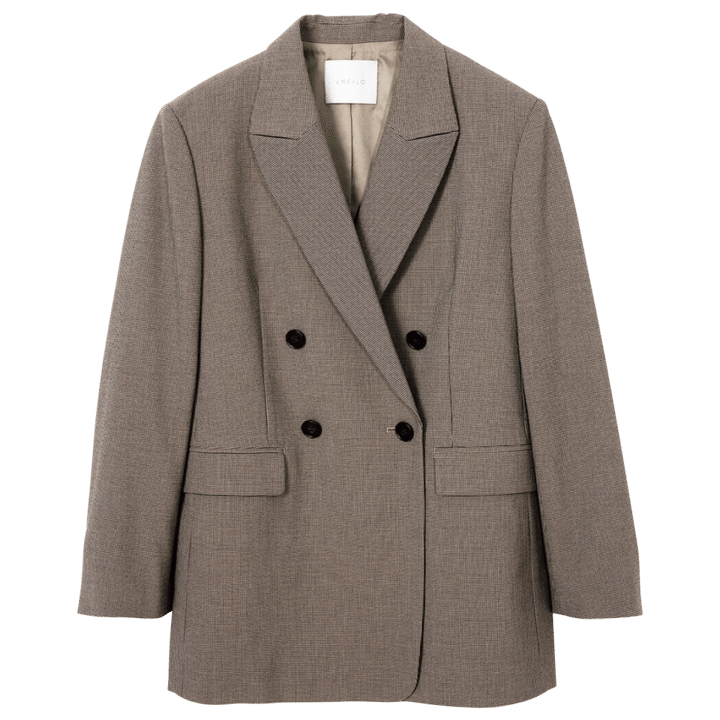 「ピークドラペルやヒップにかかる長めの着丈がマニッシュな印象のダブルブレストジャケット。肩パッドはあえて使用せずソフトに、ラフに羽織れるように仕上げました。ほどよいオーバーサイズとボクシーシルエットが女性らしさを引き立て、着こなしのアクセントになる1着」(アンフィーロ プレス 藤村咲月さん)