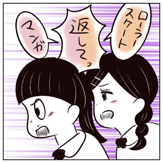 「マンガ返してっ」「ローラースケート返してっ」逃げられない状況でさなかちゃんにハッキリ伝えた2人です。