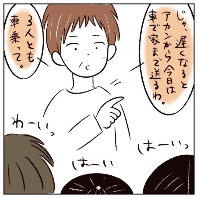 17時の約束を取り付けたまるさんのお母さんは、まるさんたち3人を車に乗せてさなかちゃんの家に送って行きました。