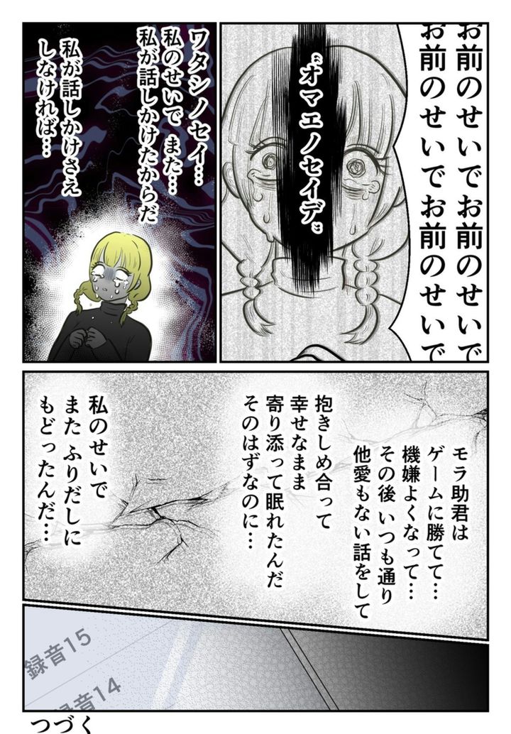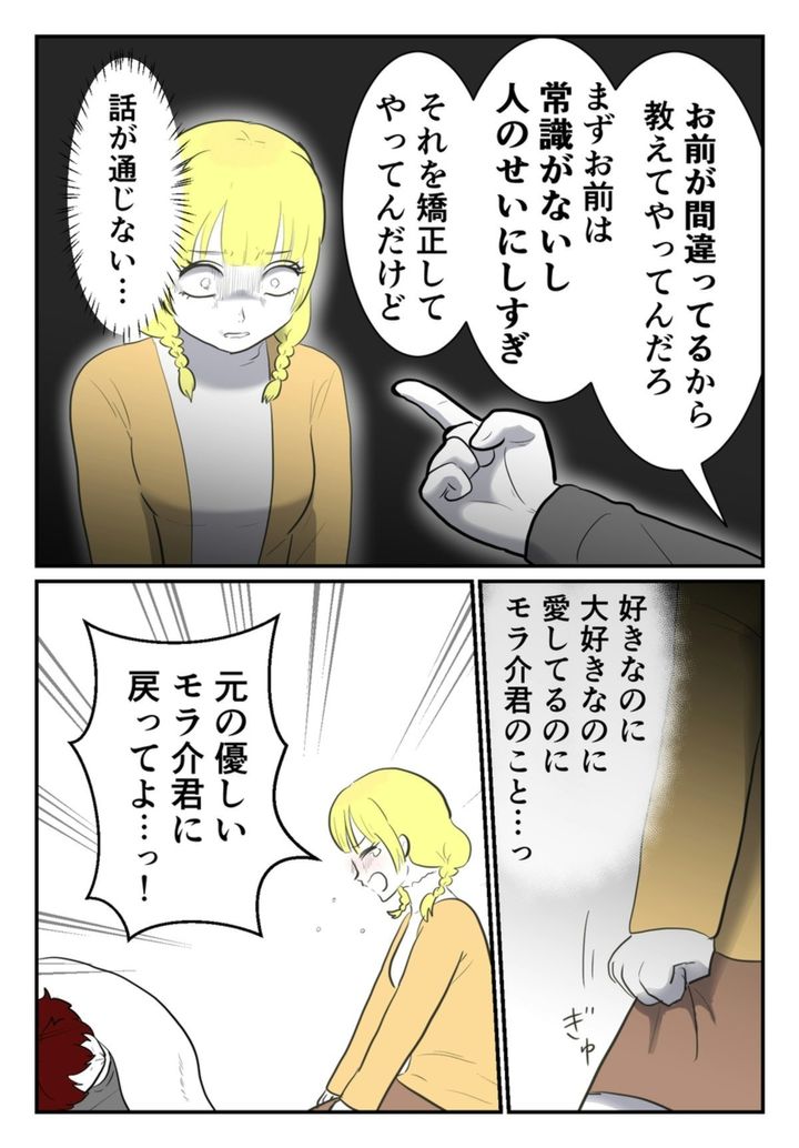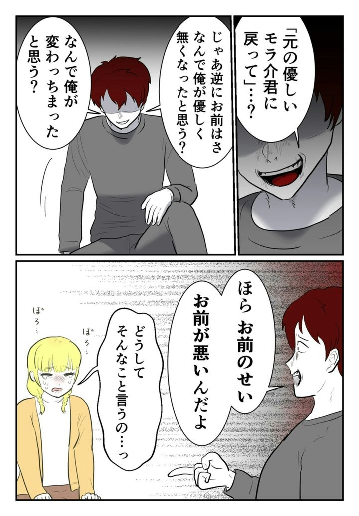 ことあるごとに、自分を怒らせたキナコさんが悪いと言い続けるモラ介。恐怖で縛り付けられたしまったキナコさんは、マインドコントロールされて自分が悪いと思い込んでしまいます。