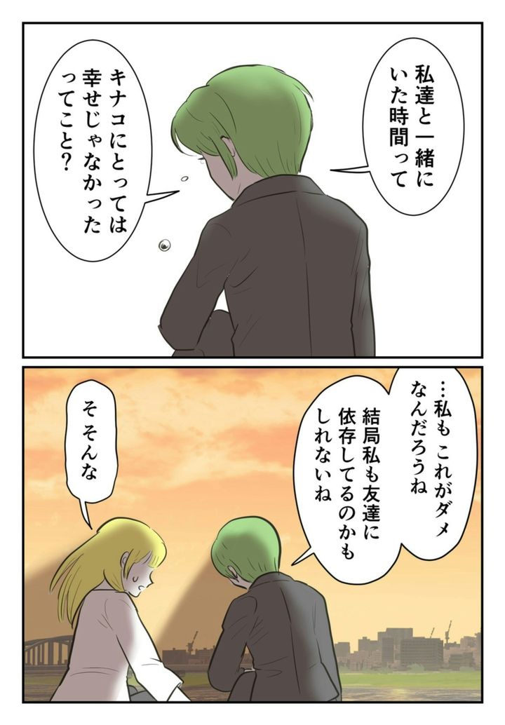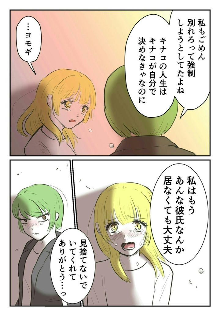 キナコさんには高校時代から仲が良い友人がいました。友人からはモラ介との交際に反対され、心配されていたキナコさんでしたが、当初はモラ介への依存で聞き入れることができませんでした。しかし、諦めずに声を掛けてくれる友人のおかげである日、目を覚ますことができたのです。