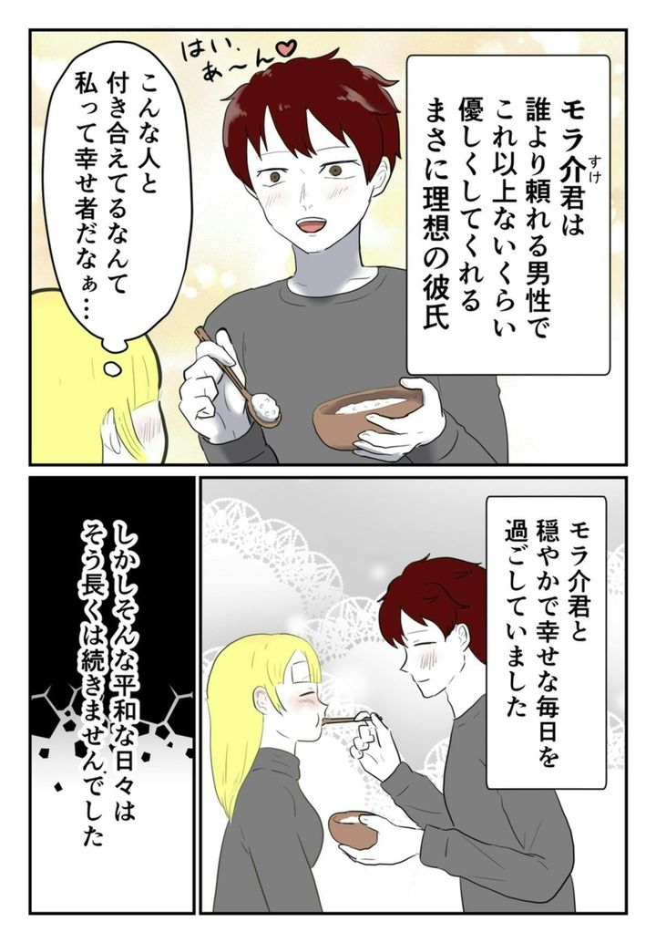 キナコさんの彼氏、モラ介は優しくて頼りがいのある男性です。けがや病気にも優しく寄り添ってくれるモラ介を心から愛していました。キナコさんにとって理想の彼氏であるモラ介との日々は穏やかで幸せそのものでした。