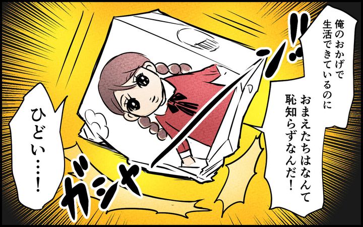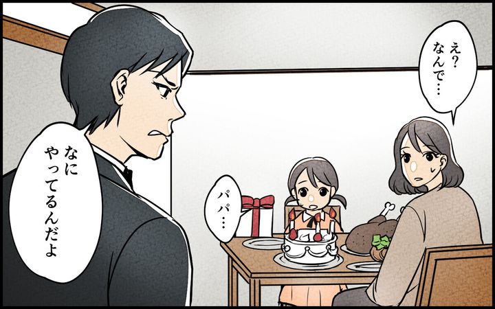・幼少期父親にクリスマスケーキを取り上げられてゴミ箱に捨てられたの思い出した。「お前たちが俺に感謝しないからだろ!」って言ってたから、当時は自分たちのせいだと思い込んでいたけど、ここで主人公がめちゃくちゃ叩かれているのを見て安心した。妻や子どもは自分の機嫌を良くする鬱憤晴らしの道具ぐらいにしか思っていないから、自分より幸せになるのが許せないんだと思う。