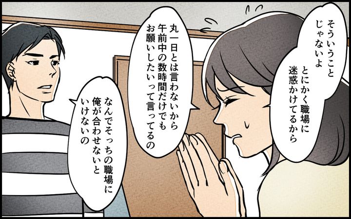 ・なんでそこで謝るのかなぁこの奥さんは。しっかり言い返さないから、この夫がつけあがる部分もあるよね。いずれにせよ、仕事もフルタイムだし、離婚まで一直線の話だよね。