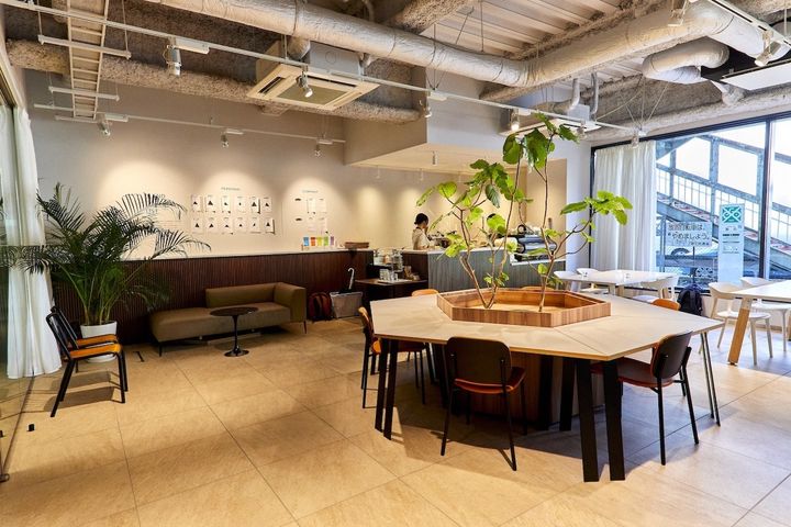 癒やしを与えてくれるグリーンが目隠しとなり、ひとりでも、グループでも使いやすい配慮がされています。店内3カ所にコンセントプラグが用意されていて、カフェ利用者は90分間無料で利用することも可能。高速Wi-Fiが完備されていて、テレワークでの利用にも最適です。