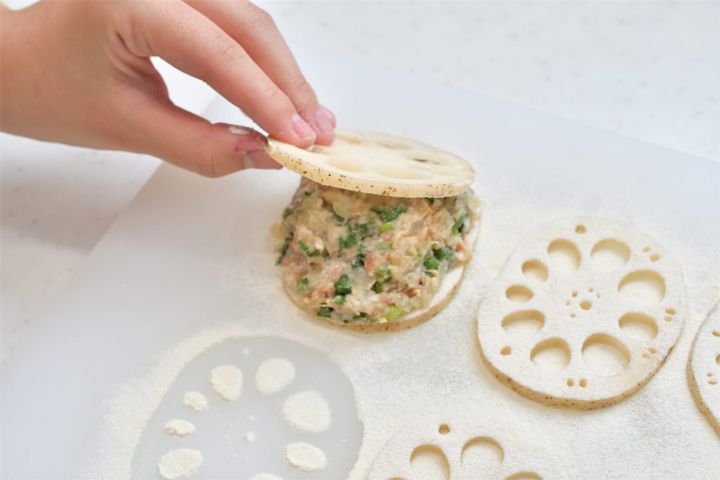 8. れんこんの小麦粉をかけた面に、1cm厚さを目安に肉ダネをのせ、さらにれんこんスライスで挟む。