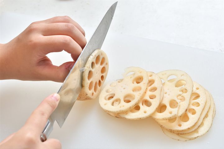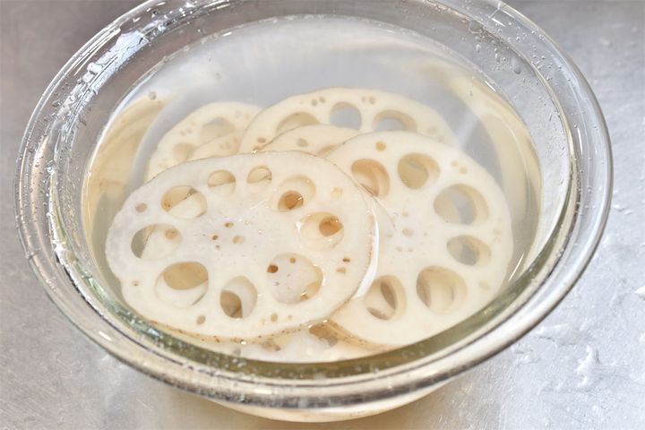 4. れんこんを薄くスライスし、水にさらす。