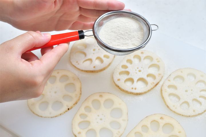 7. れんこんの水気を切り、小麦粉をまぶす。