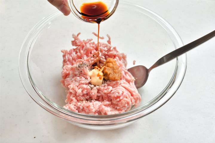 5. 豚ひき肉をボウルに入れ、塩とこしょう、しょうゆ、マヨネーズ、みそを加え、粘り気が出るまでこねる。
