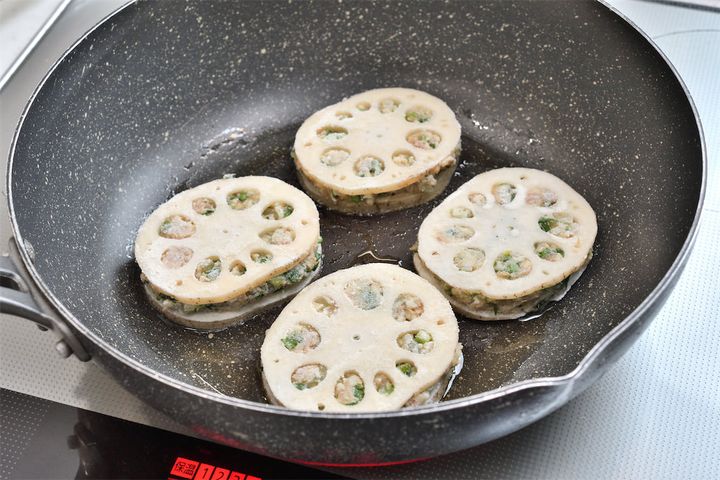 れんこんを薄くスライスして、小麦粉をまぶす手間はありますが、餃子を包むのが苦手、という人にとってはこっちの方が簡単に感じると思います。1つに肉ダネをたっぷり乗せられますし。