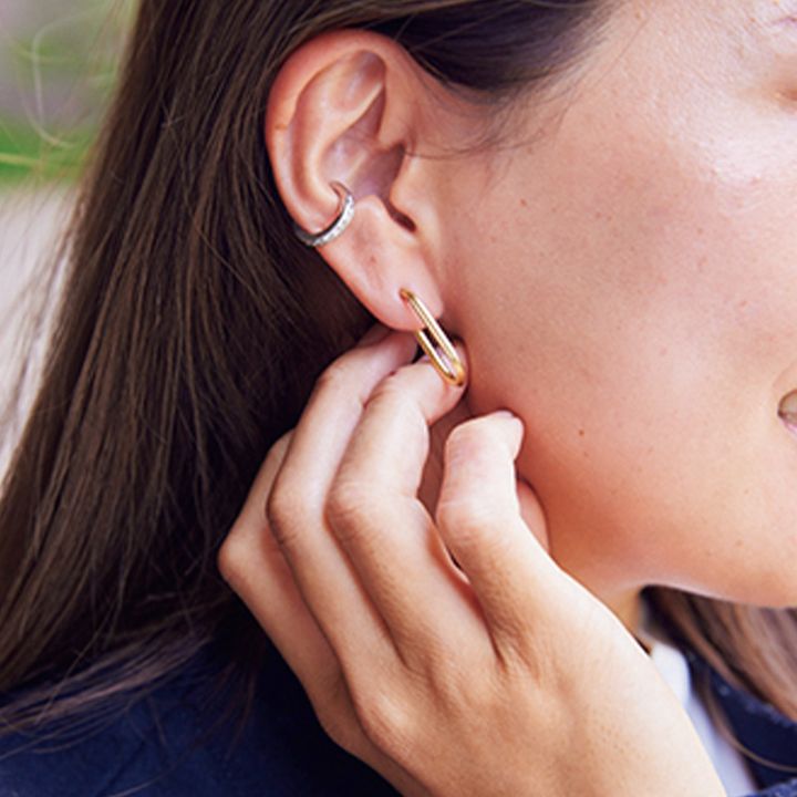 デニムでカジュアルな日こそ、耳元は複数付けで華やかに。ピアス・イヤカフはヒロタカのもの。秋はシルバーとゴールドのミックスが気分です。