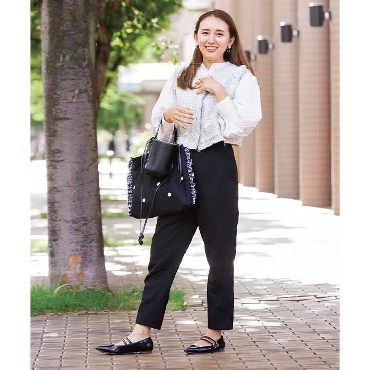 長女が小学校に入学し、公立小学校には幼稚園以上にいろんなファッションのママたちがいることを実感。きちんと見えしながらもオシャレ感を演出してくれるショート丈ジレの便利さに行きつきました。ツイード素材で季節感を出しつつ、大きめボタンでかしこまりすぎないところもお気に入り。参観のマストアイテム・サブバッグはお友達に作ってもらったものです。