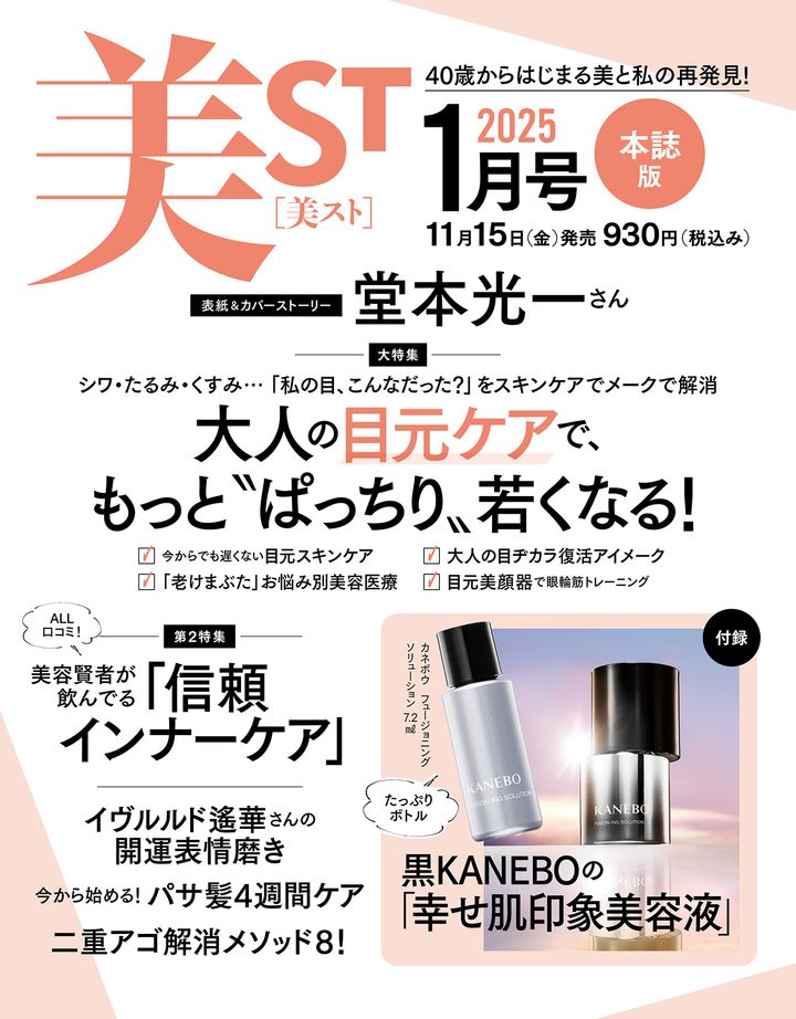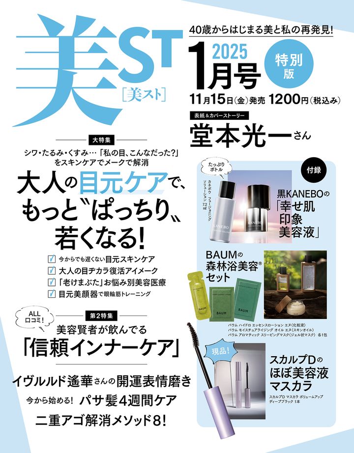 11月15日(金)発売・美ST1月号のネット書店での予約受付が始まりました!本誌・特別版ともに堂本光一さんが表紙を飾ります!付録は、黒KANEBOの美容液をたっぷりミニボトルで、特別版にはさらにBAUMの森林浴美容®セットとスカルプDのほぼ美容液マスカラが現品付録でつく豪華仕様です。ネット書店が完売の場合はお近くの書店で、完売前にぜひお早めにご予約ください!