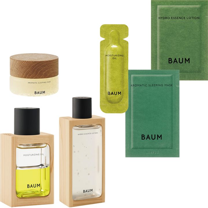 森の恵みで癒しとうるおいを。BAUMの森林浴美容®をラインでお試しできます。ハイドロ エッセンスローション n パウチ1包、モイスチャライジング オイル n パウチ1包、アロマティック スリーピングマスク パウチ1包