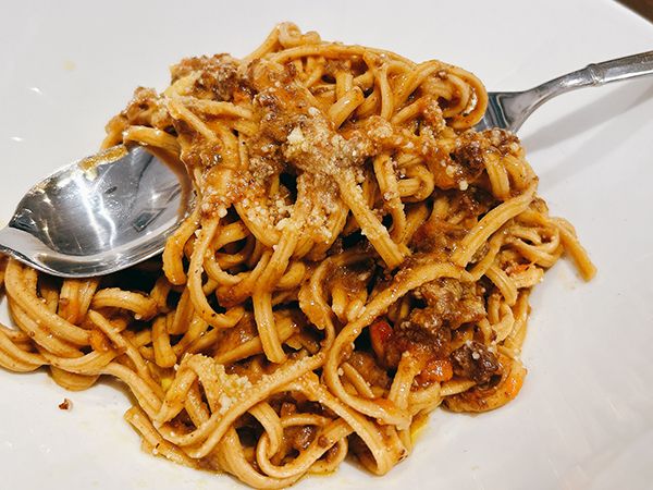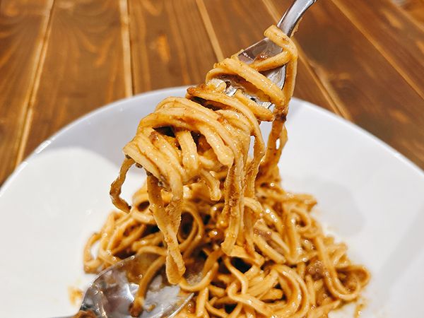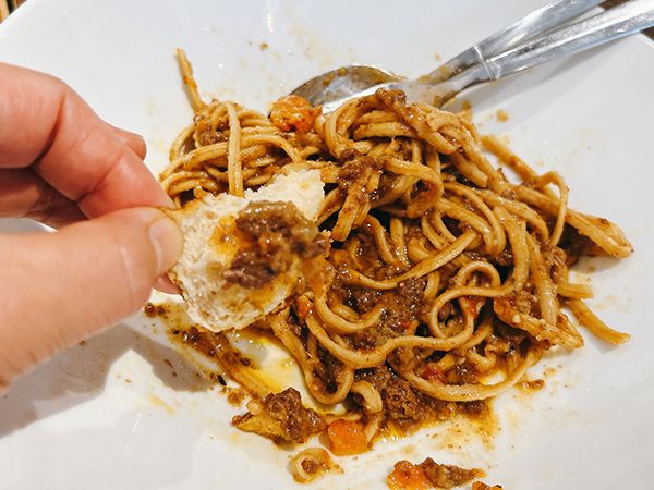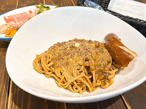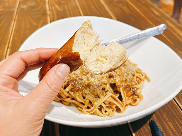 具材たっぷりのボロネーゼは水は一切使わず、肉と野菜とトマトソースで煮込んだもの。濃厚で旨みが強い! こだわり麺と絡めるとさらに力強くガツンと胃袋を満たします! 気前がよいソースの量なので、ソースと麺をしっかり絡めましょう。もちろんパンに付けて食べても美味です。