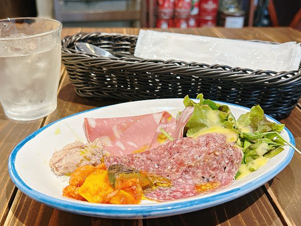 ミニオードブルとミニサラダのワンプレートがすぐにやってきました! ハムやラタトゥユ、若鶏モモ肉のリエットが彩りよく並びます。前菜だけでテンション上がりますね~♥