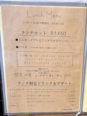 ランチメニューは一択。 ミニオードブルとミニサラダのワンプレート&パスタの「ランチセット」1815円(税込)。 悩まなくていいのですが、パスタは定番6種+本日のスペシャルパスタ3種から選ばなければなりません。「ピザ職人風」とか「イカスミ」とか……う~迷う!
