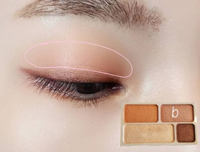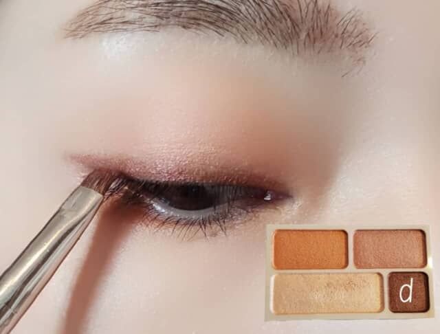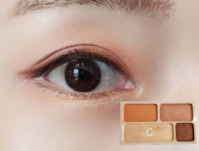 一気に華やいで多幸感溢れるアイメイクが完成。cは色っぽくなりすぎない色味なので色浮きせずきれいになじんでくれるでしょう。また、同時に上まぶたの中央にcを入れると、ころんと丸い印象を演出できます。