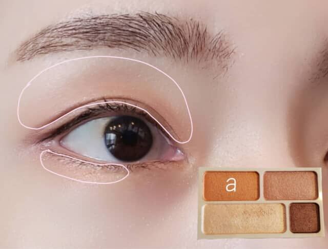 STEP.1 aのカラーを大きめのブラシにとってアイホールと下まぶたの囲みラインのエリアに入れる