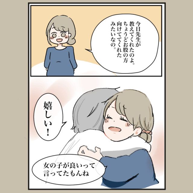 「今日先生が教えてくれたのよ。ちょうど性別が分かる位置だったみたいなの」ゆうかさんがそう伝えると「嬉しい!」と言ってママに抱き着くご主人。ゆうかさんは「女の子が良いって言ってたもんね」と言いました。