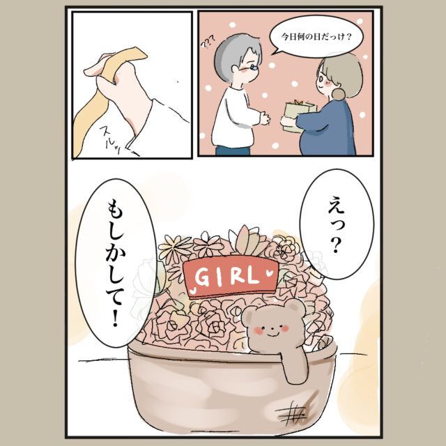 娘の叶実(かなみ)ちゃんがまだお腹にいた時のこと。病院に診察に行ったママゆうかさんに、エコーで診察する先生、すると「もう5カ月なので性別が・・あ!」と声をあげました。「どっちですか!?」すかさずたずねたゆうかさんは、診察後にお買い物をして帰宅し、自宅で待っていたご主人に「じゃーん!プレゼント!開けてみて!」と差し出しました。