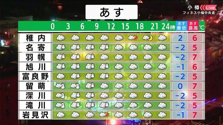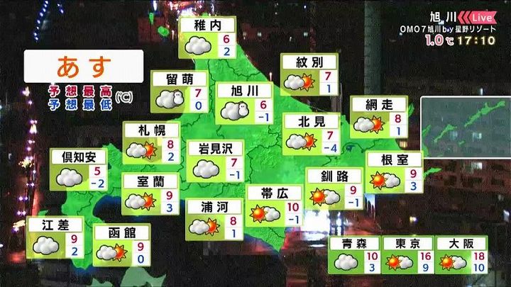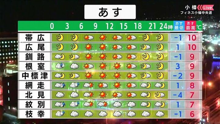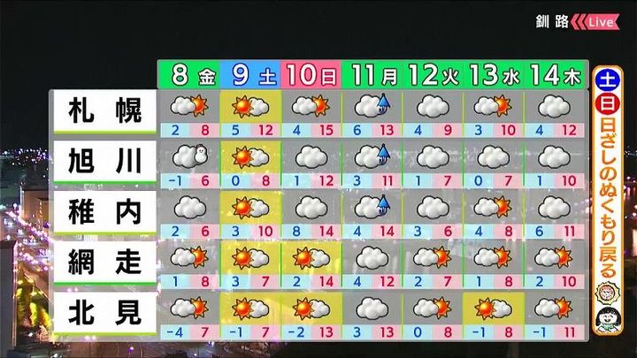 網走や紋別で明け方までミゾレが降りますが、日中は広く日ざしが出るでしょう。最低気温は0度くらいで、十勝の陸別町では8日朝もマイナス5度を下回りそうです。