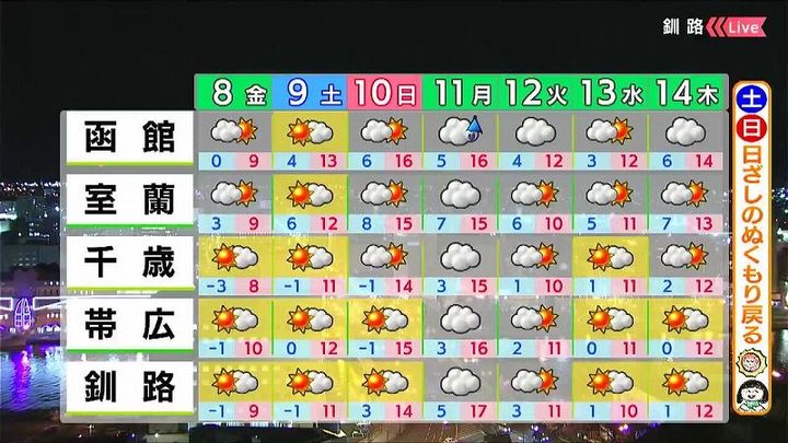 背景は7日午後5時10分ごろの釧路情報カメラ。釧路では7日夜、初雪を観測しました。ほぼ平年並みでした)今後1週間、釧路で雪が降ることはなさそうです。
