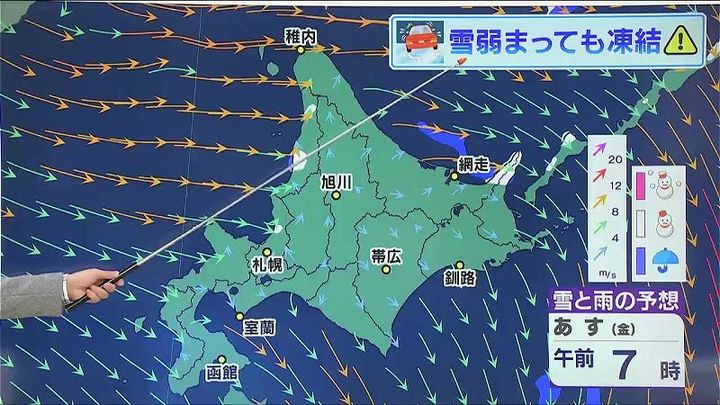 8日朝になると西風に変わり、雪もやんでいく見込みです。ただ、引き続き路面凍結に注意して下さい。