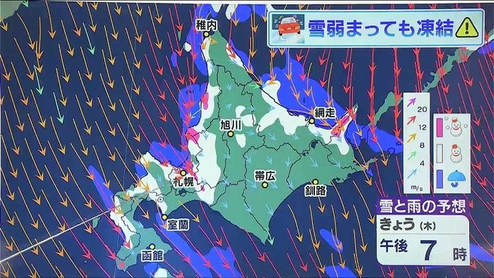 7日午後7時、北西の風に乗って日本海側やオホーツク海側で白色、雪が降り、札幌周辺、留萌周辺、知床周辺は紫色、雪が強まります。