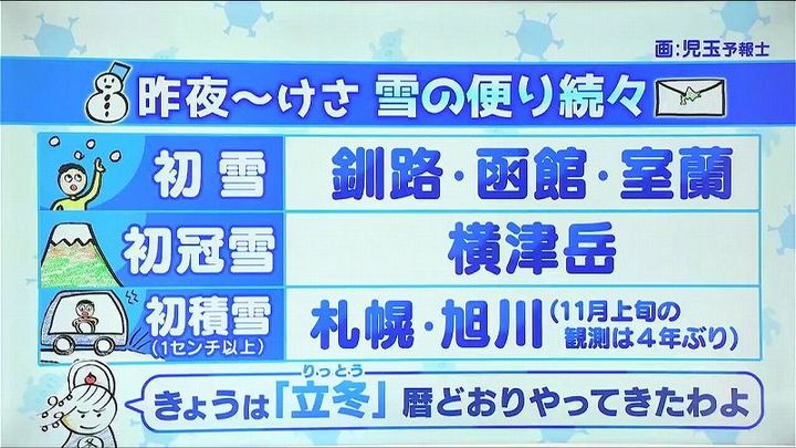 6日夜から7日朝にかけて、釧路や函館、室蘭で初雪、函館では横津岳の初冠雪も観測されました。