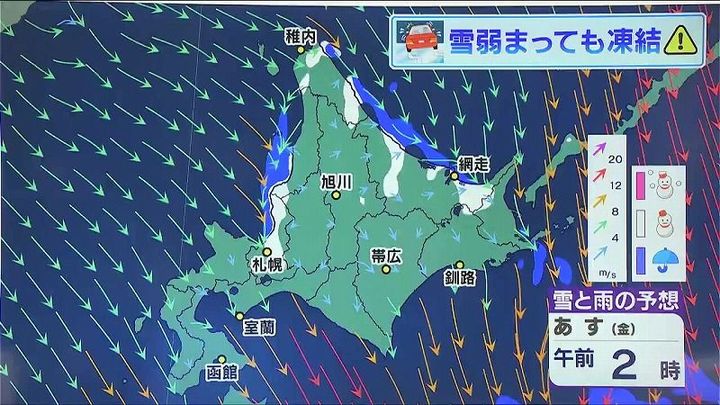 背景は7日午後5時10分ごろの旭川情報カメラ。橋の上やトンネルの出入り口などの凍結に注意して下さい。7日夜から8日明け方にかけてうっすら積もるおそれがあります。