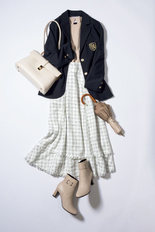 ネイビージャケット×ツイードスカートで、冷え対策をしつつオフィスでも浮かないフォーマル感を演出。折り畳み傘を常に持ち歩いておくと、この時季に多発する急な雨にも余裕を持って対応可能です♪