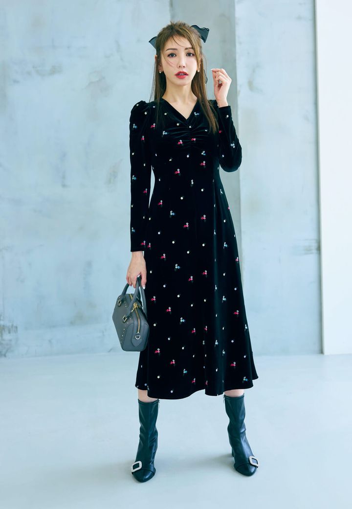 ベロアワンピース¥27,500、リボンヘアクリップ¥7,150、ピアス¥5,940、バッグ¥18,700、ブーツ¥25,300/以上CELFORD