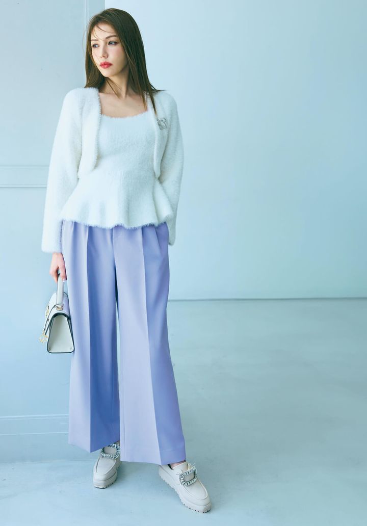 アンサンブルは、ペプラムのキャミソールとボレロのセット。上がボレロなのでペプラムがきれいに出て、体形カバーにもお役立ち。ファーの優しい印象は、ラベンダーやピンクのパステルカラーと合わせることでひときわ際立つ。