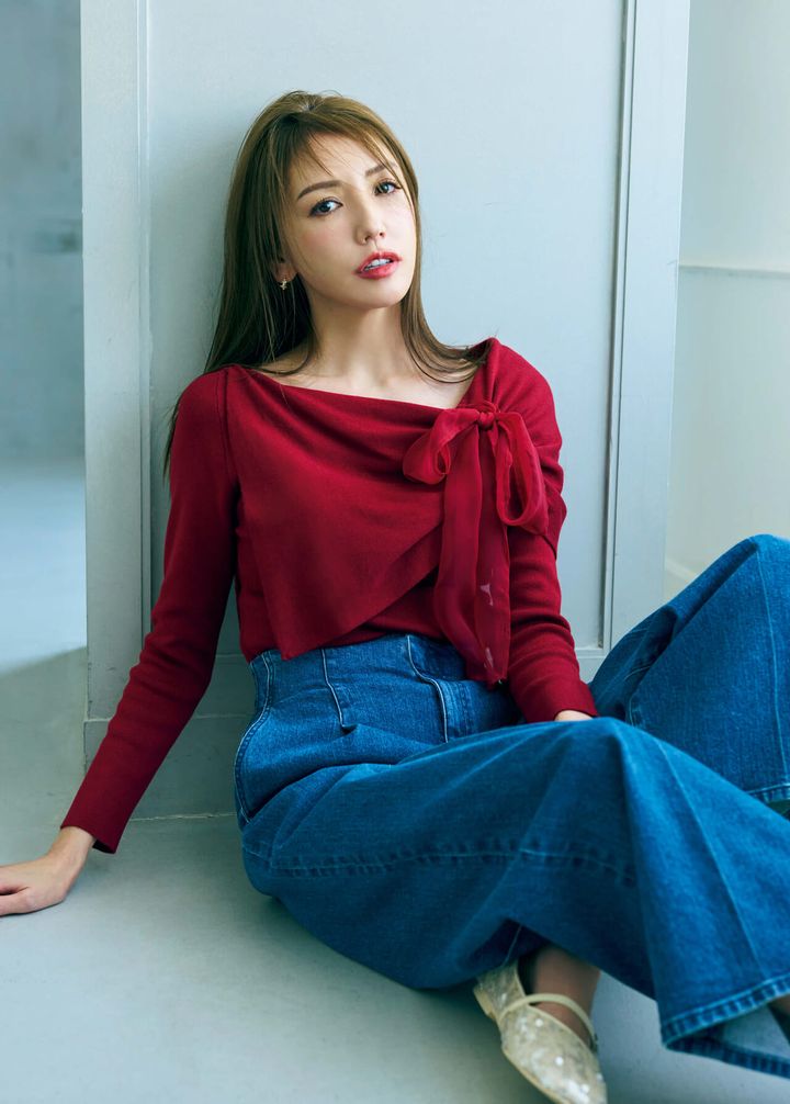 赤ニット×デニムは、Xmasムードを盛り上げる冬カジュアルの王道。今年はこんなリボン付きニットとハイウエストデニムで、スタイルUPと女らしさを極めたい! ニットはフロントのドレープが美しく、ワンツーコーデでもおめかし感は十二分。程よいデコルテの肌見せもフェミニニティの決め手に。