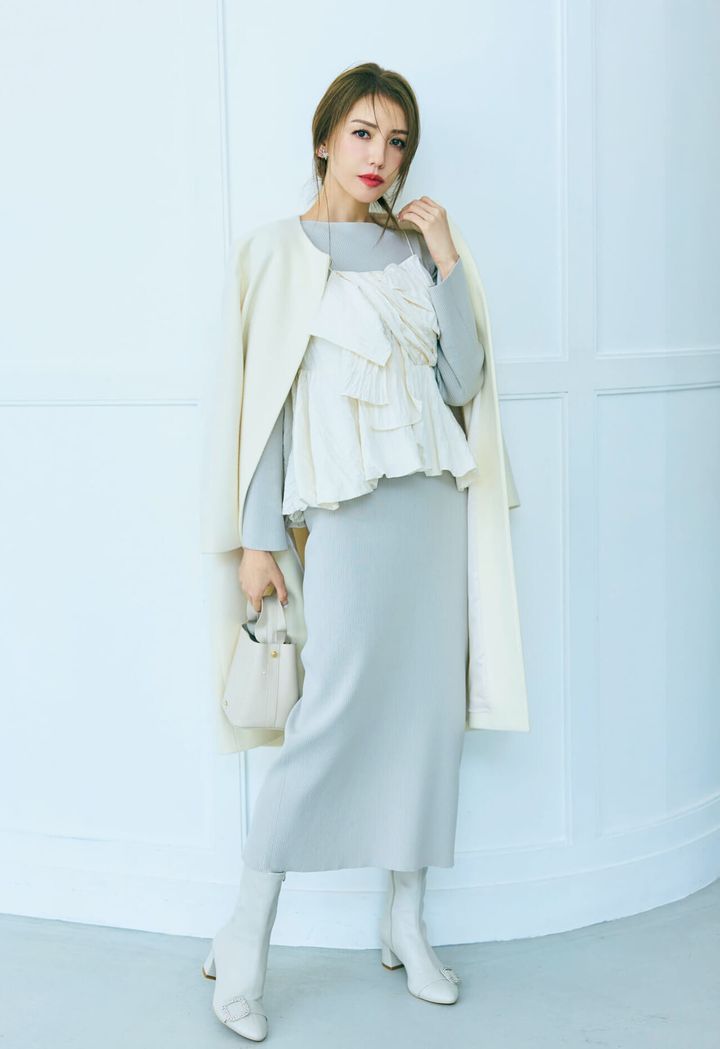 単品で着回せるのはもちろん、レイヤードならたちまち上級者を気取れるリブワンピ×キャミのセット。立体的なキャミのシルエットなら、白×薄グレーの色合わせでも華やかな着こなしに。カシミアブレンドのコートを羽織ってコーデにクラス感を演出。