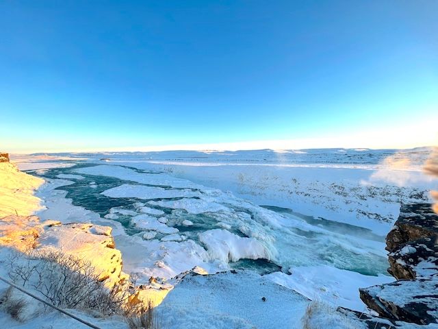 グトルフォスは、アイスランド語で「黄金の滝」という意味で、滝が太陽の光に照らされ黄金に輝くこと名付けられたそう。筆者が訪れた際も西陽に当たって水がキラキラと輝いていて、その名前を感じることができました。冬になると、日が出ている時間が短いですが、ぜひ太陽が出ているタイミングで訪れるのがおすすめ。