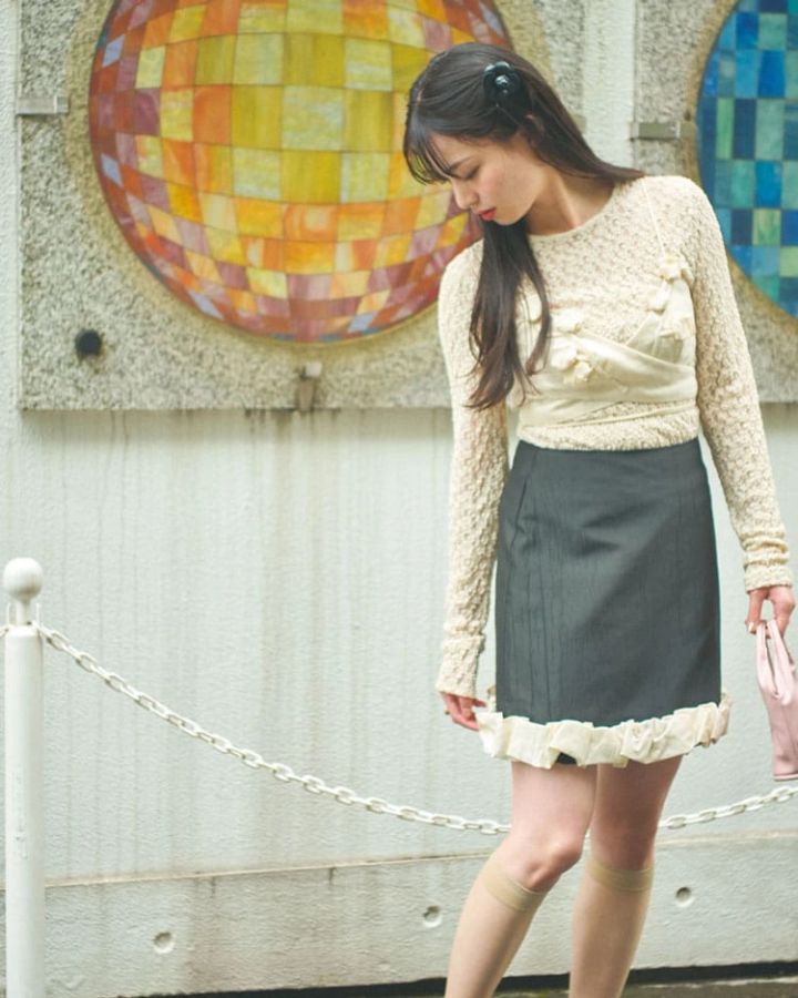 ビスチエ 6,590円/ZARA(ザラ) レーストップス 55,000円/Vince(コロネット) スカート 16,280円/シスタージェーン(ザ・ウォール ショールーム) バラのヘアクリップセット 25,300円/レレットニューヨーク(THE HAIR BAR TOKYO) ピンクバッグ 11,400円/ヨミム(HANA) ソックス 1,210円/靴下屋(Tabio)