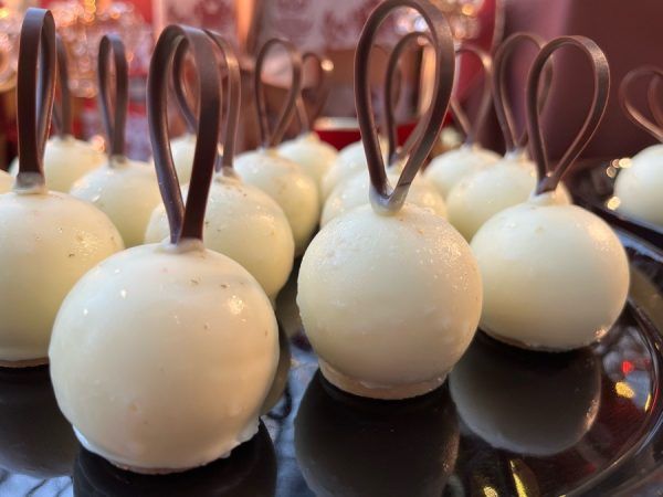 クリスマスツリーに飾れそうな丸い形で、中にはシナモンなどのスパイスとたっぷりのベリージャムを包んだクリーム。更にコーティングのホワイトチョコには、金箔がキラキラでゴージャス!