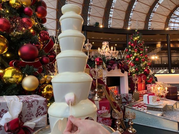 秋はハロウィンにちなんだカボチャ色のチョコレートファウンテンでしたが、今回はホワイトクリスマスをイメージしたホワイトチョコレートです。