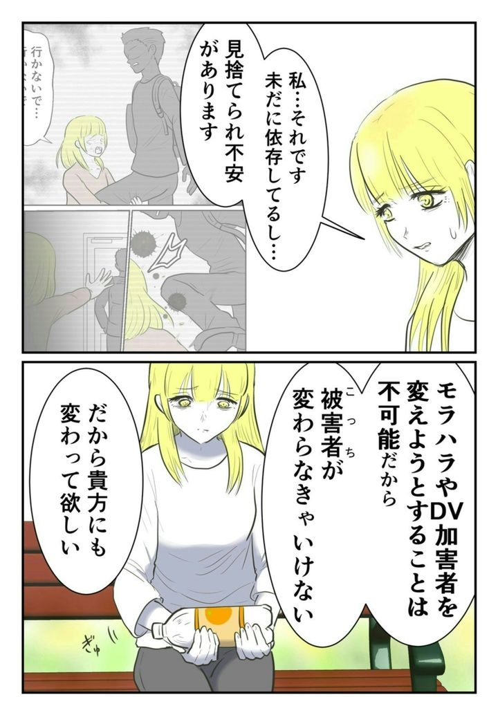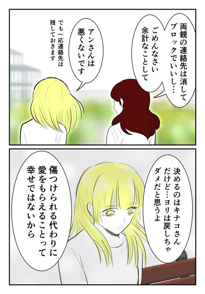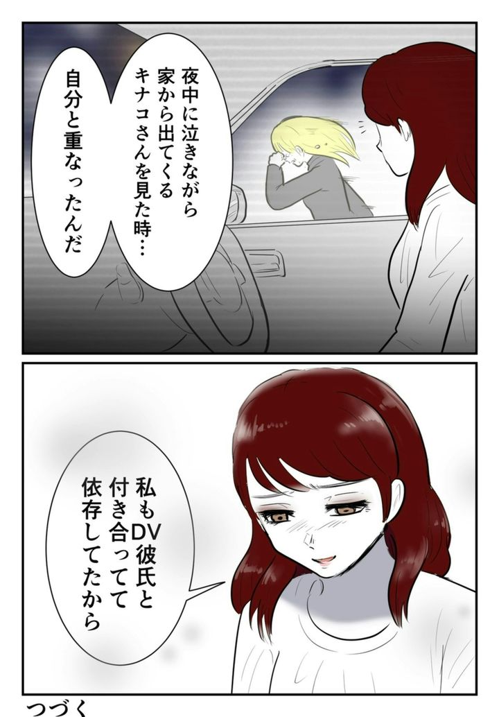 それでも、「被害者が変わらなければいけない」と教えてくれたアン。そしてアンの言葉で、キナコは自分には心配してくれる友人がいることを思い出します。その後、キナコは友人と会い、自分を本当に大切にしてくれる人と一緒にいる心地よさを再認識。DV彼氏の元に戻ってしまうことはありませんでした。
