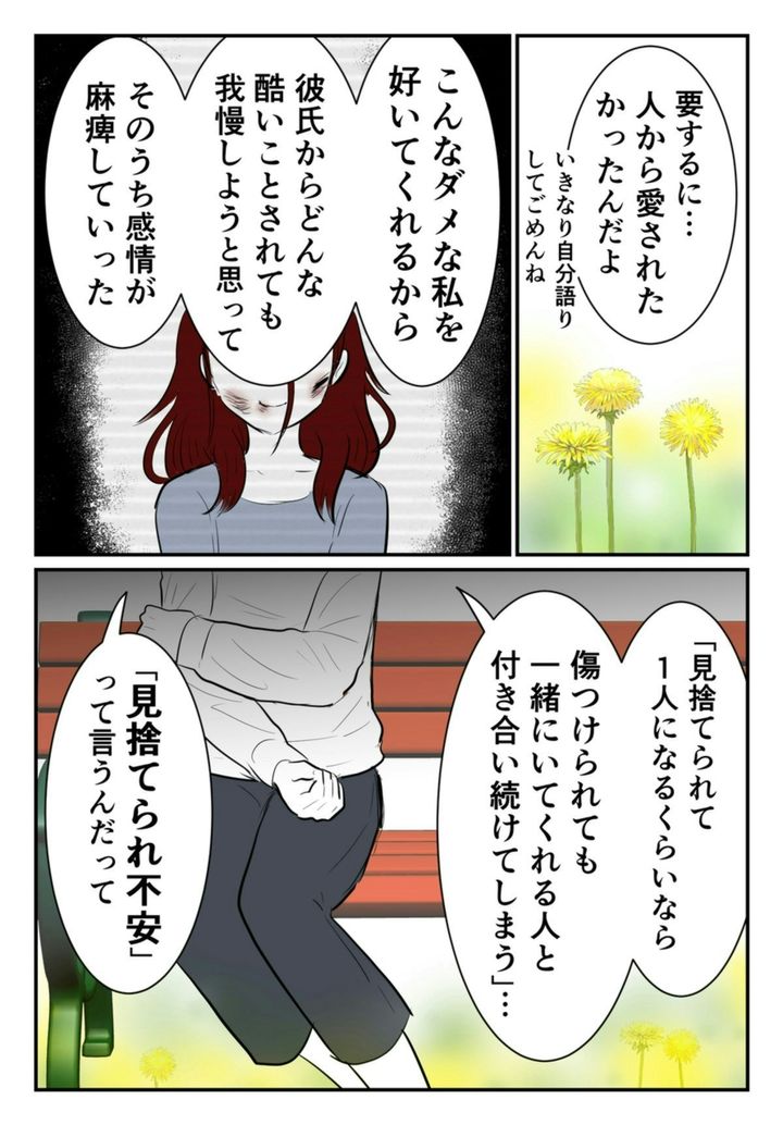いわゆる「機能不全家庭で育った」と告白したアン。幼いころ、愛情を与えられた記憶がないといいます。すると徐々に、モラ介は素行が悪くなり、果てにはDVで交際相手を支配するようになってしまったようです。またアンは、DV彼氏と別れることができず「見捨てられ不安」に悩まされた過去がありました。