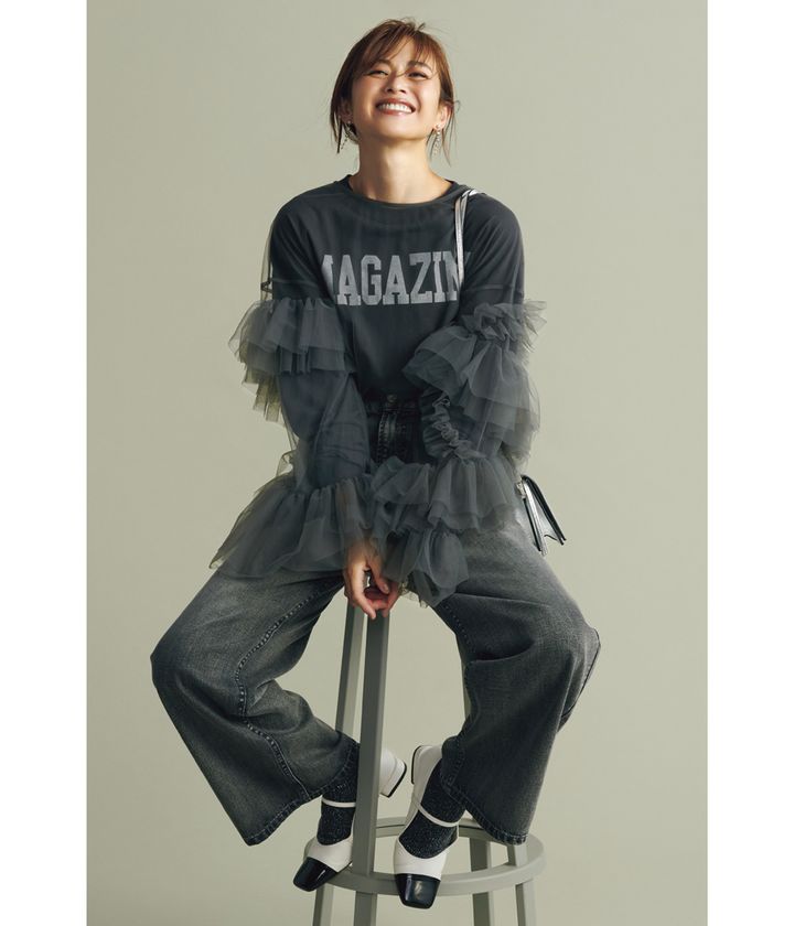 ロゴT×デニムにチュールブラウスを重ねた旬な甘辛コーデはトレンド感のある足元でよりモードに格上げ。大人の可愛げを印象づけるメリージェーンにラメソックスを合わせて程よく甘さを中和。グレーのワントーンにバイカラーが映えます。