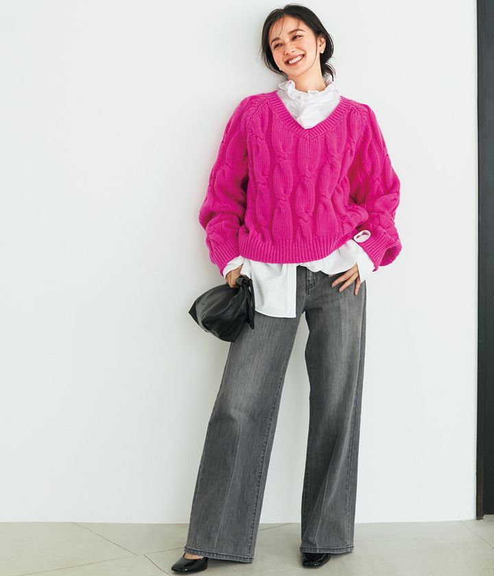 ニットの下にレイヤードするならフリルブラウスも気負いなく挑戦できる! パキッとピンクの色選びも甘くなりすぎず◎。