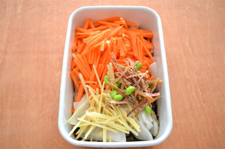 4.保存容器に1の大根、[A]、青ばた豆を入れたら、3を注ぐ。