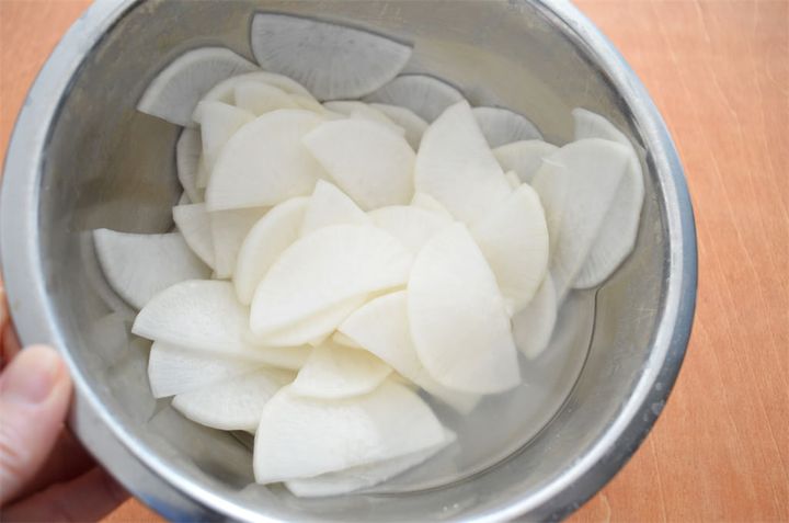 1.大根の皮を剥き、5mmくらいの厚さの半月切りにしたら、塩をまぶして軽く揉み1時間おく。ザルにあげ、水分を十分に切る。