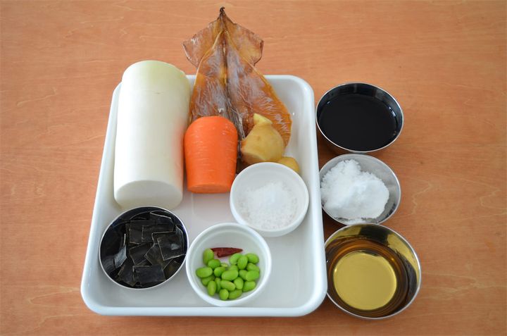 するめを筆頭に、昆布やしょうが、大根、にんじんから旨味が大放出!