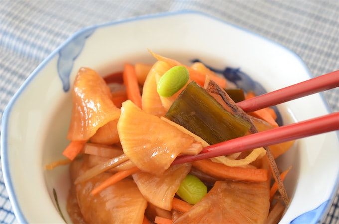 日本各地を見渡すと、お漬物のバリエーションは無限にありますね。わたしは北海道の「松前漬け」や福島県の「いかにんじん」など、野菜だけでなく魚介類や昆布などを漬け込むお漬物が特に大好きです!そんなわたしに、福島県の農家が「大根のカラフル漬け」を教えてくださいました。大根やにんじんを、旨味たっぷりの昆布やするめと一緒に漬け込むんですって。ご飯が止まらなくなること間違いナシの予感!ってことでさっそく作っていきたいと思います♪