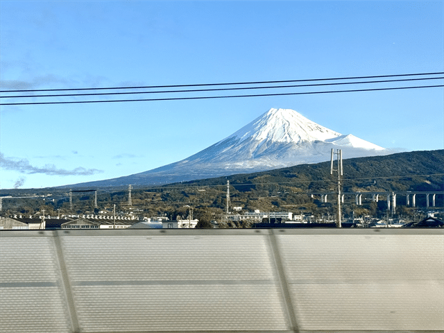 三島駅通過後少し経ってからが、富士山が最もきれいに見えるポイント。車内でスマホのシャッター音が聞こえてきて気づくこともありました。
